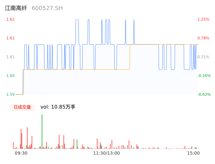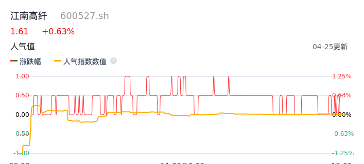 04月25日,江南高纤收报1.61,股价涨幅0.63%,成交金额1741.26万元,换手率0.63%。