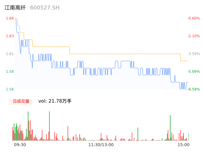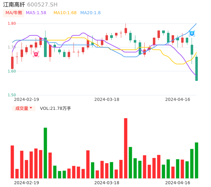 04月16日,江南高纤收报1.56,股价涨幅-6.59%,成交金额3491.30万元,换手率1.26%。