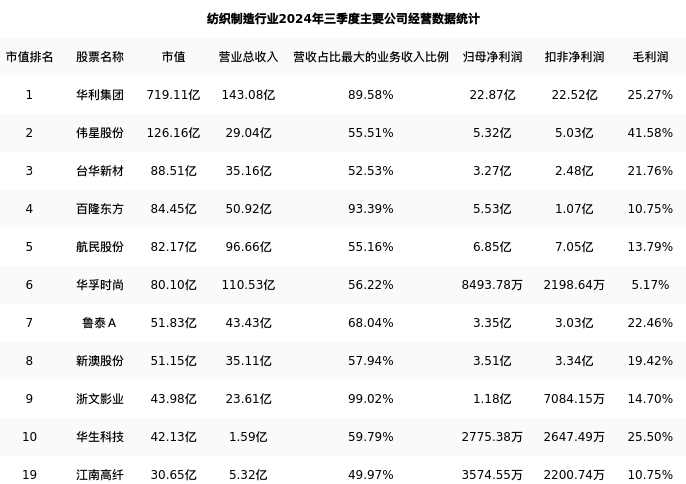 江南高纤最新报告期数据为三季度,下表汇总了纺织制造行业内市值靠前的公司三季度主要经营数据