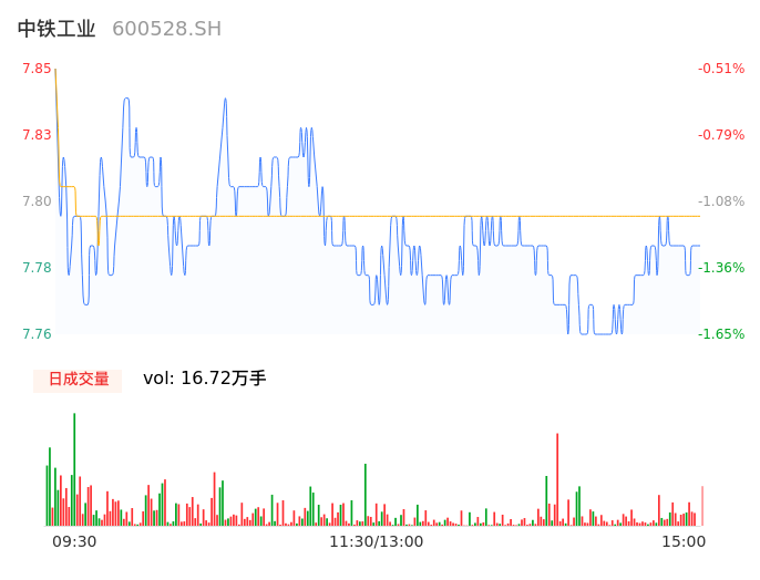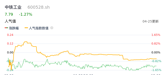04月25日,中铁工业收报7.79,股价涨幅-1.27%,成交金额1.30亿元,换手率0.75%。