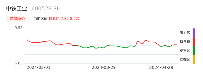 我们来看一下该股的九方特色指标强弱趋势的情况:中铁工业近日从观望区上穿到持仓区。股价短期站稳多头区域,上升动能仍较为充足,可积极关注。后续重点关注上方压力位:8.62元是否能突破上攻。