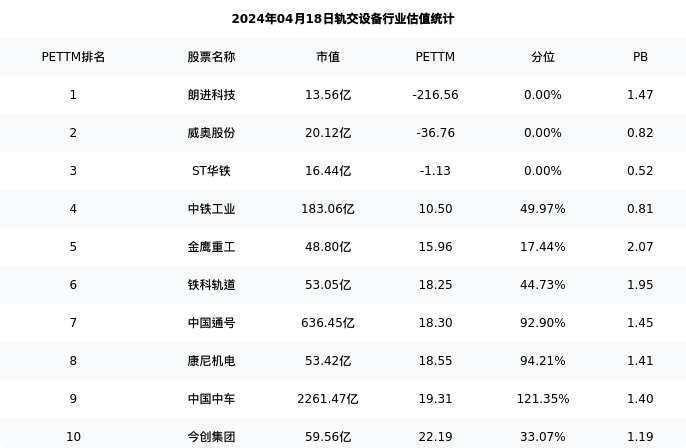 从估值角度看:中铁工业最新市盈率PETTM为10.50,在行业内排名1/31,处于49.97分位。