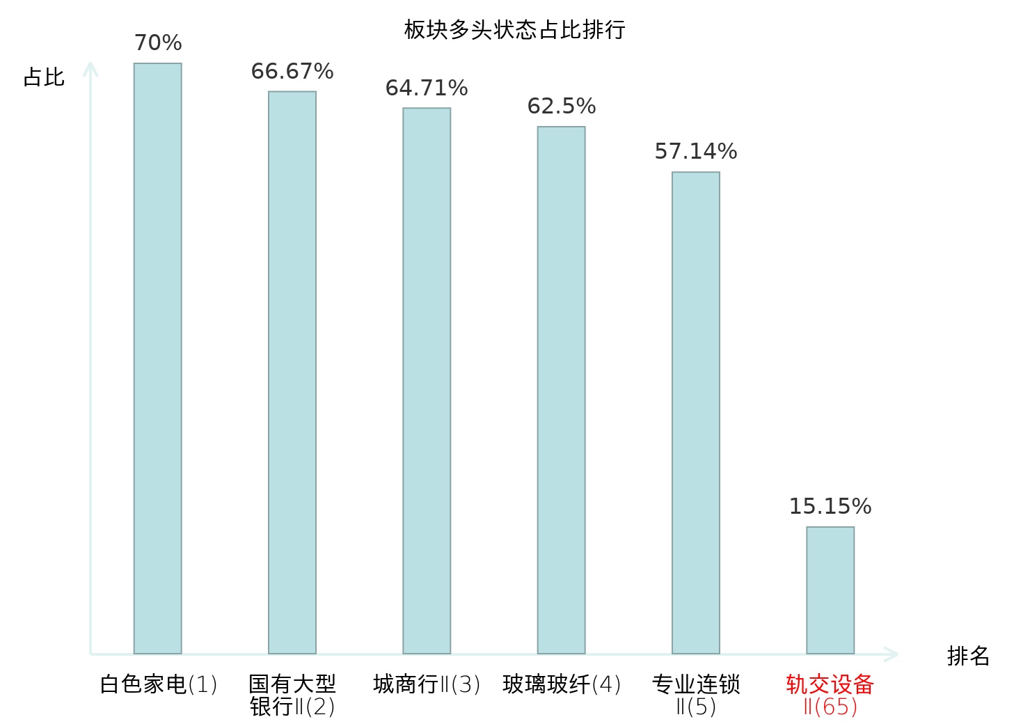 全市场所有行业板块中主力多头状态占比排名中,白色家电板块位居第一。油气开采Ⅱ板块名次提升最快,较昨日上升96位。