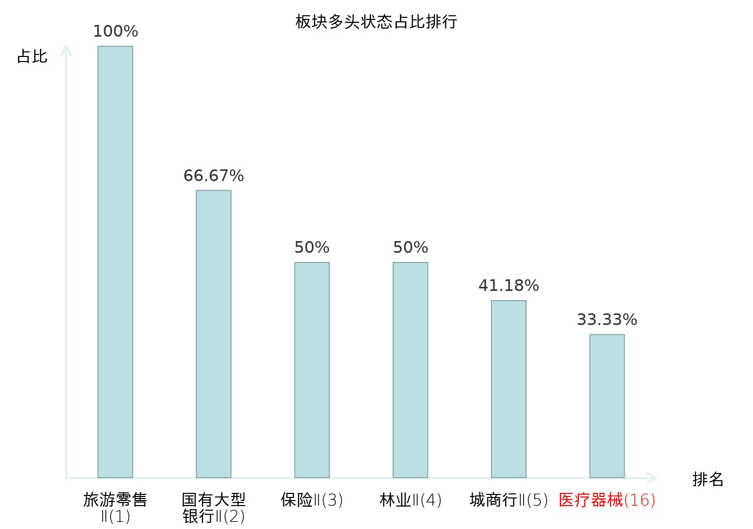 全市场所有行业板块中主力多头状态占比排名中,旅游零售Ⅱ板块位居第一。林业Ⅱ板块名次提升最快,较昨日上升87位。