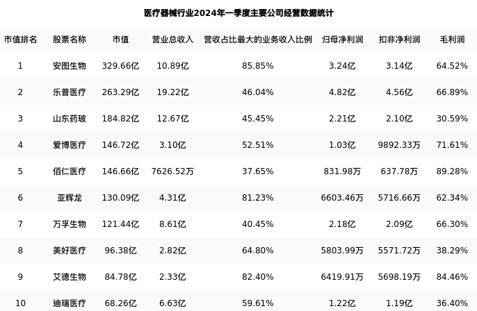 山东药玻最新报告期数据为一季度,下表汇总了医疗器械行业内市值靠前的公司一季度主要经营数据
