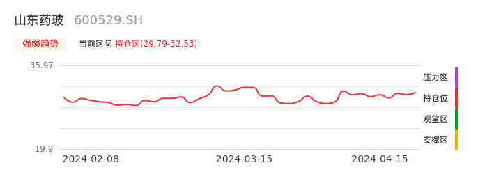 我们来看一下该股的九方特色指标强弱趋势的情况:山东药玻自03月13日从压力区回到持仓区。股价在持仓区盘整一段时间后,目前有启稳迹象。后续重点关注上方压力位:32.53元是否能重新上攻。