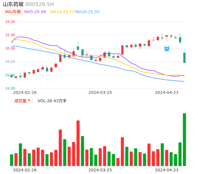 04月23日,山东药玻收报27.85,股价涨幅-9.99%,成交金额7.41亿元,换手率3.98%。