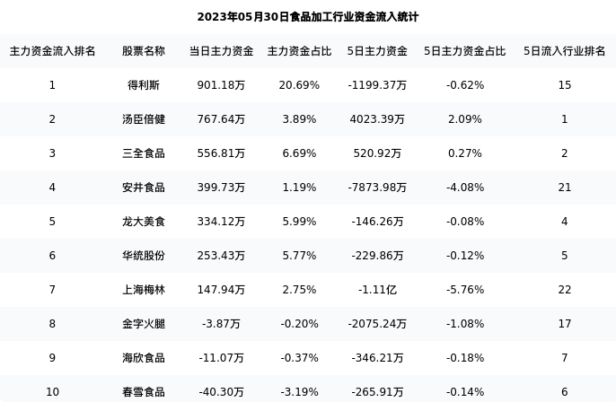 从主力资金流向来看,食品加工行业今日主力资金流入3.50亿元,在所有申万二级行业中排名:8/131。