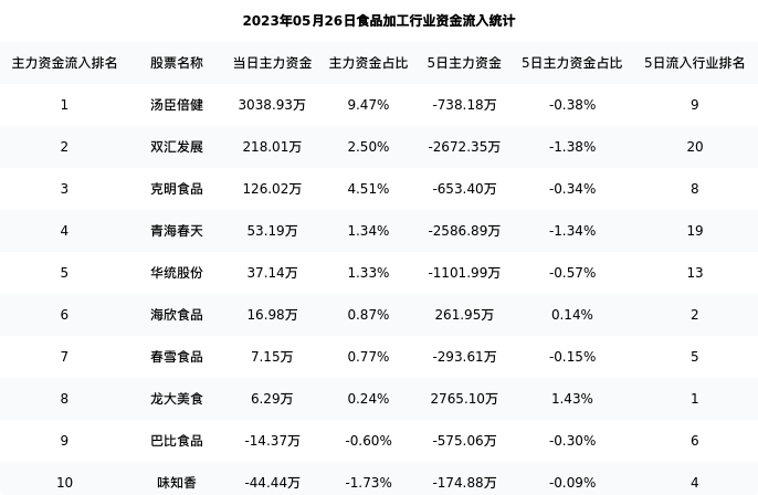从主力资金流向来看,食品加工行业今日主力资金流入2.26亿元,在所有申万二级行业中排名:7/131。