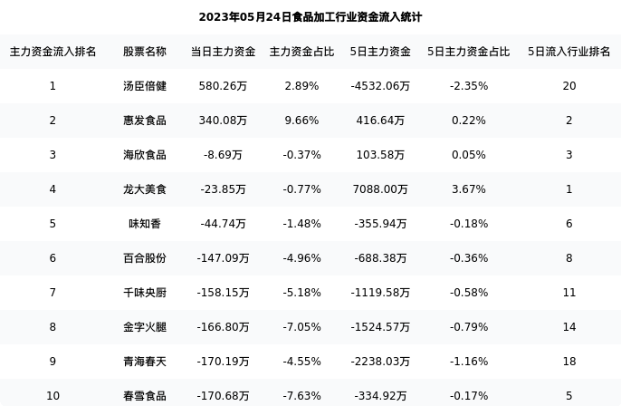 从主力资金流向来看,食品加工行业今日主力资金流入2.85亿元,在所有申万二级行业中排名:112/131。