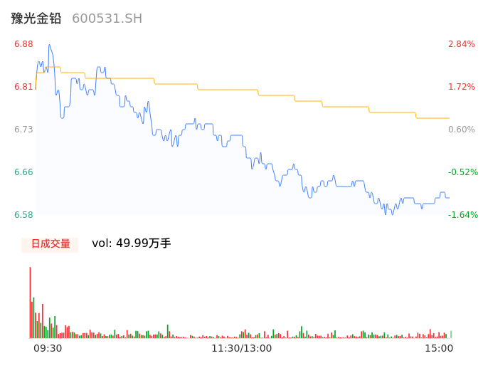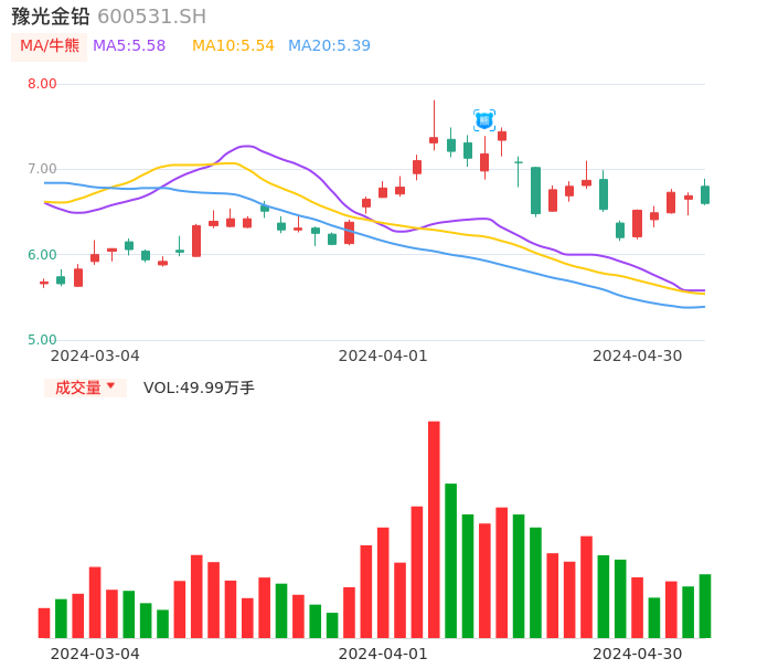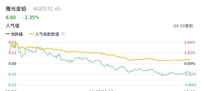 04月30日,豫光金铅收报6.60,股价涨幅-1.35%,成交金额3.37亿元,换手率4.59%。