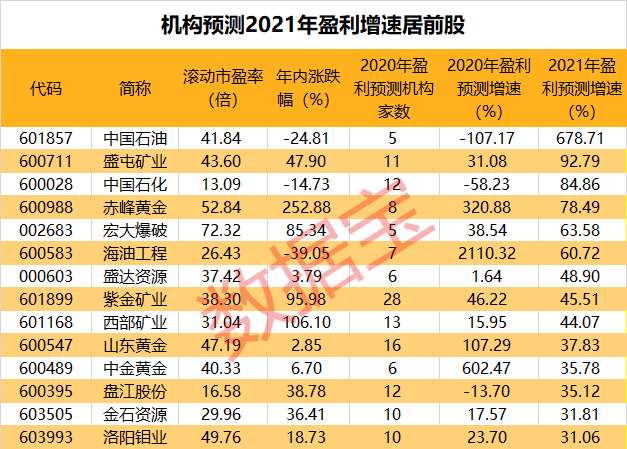 如果考虑机构对2021年的盈利预测,中国石油、盛屯矿业、中国石化、赤峰黄金和宏大爆破的净利润增速居前,增速均超60%。