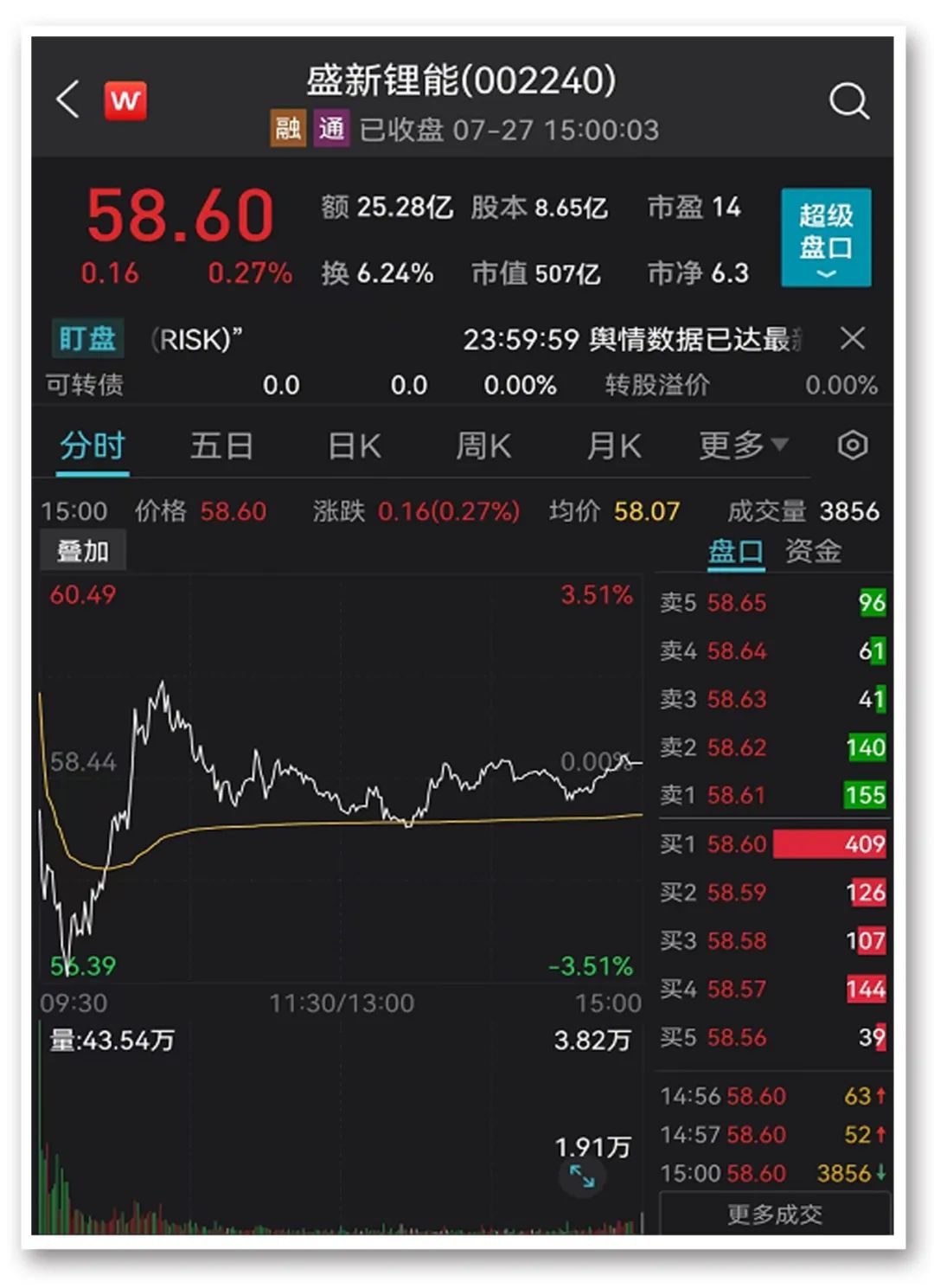 同样是业绩大增、今日股价却表现不佳的还有盛新锂能,其股价早盘一度跌逾3%,收盘微涨0.27%,报58.6元/股,市值507亿元。