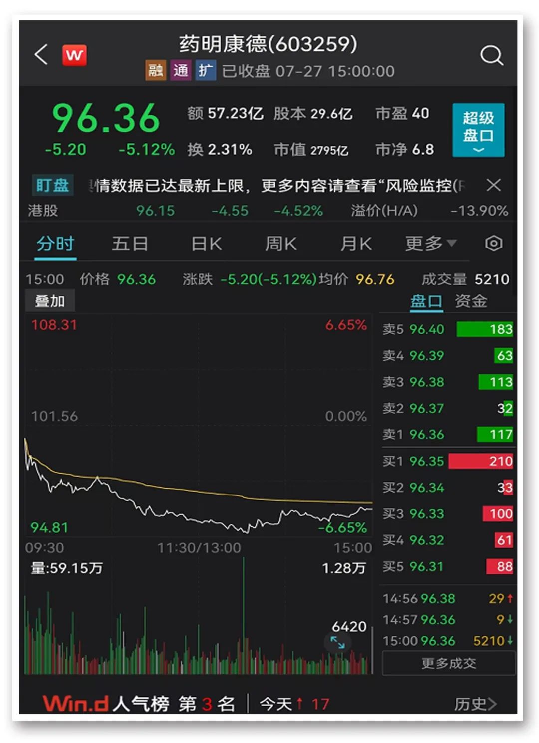 有“药界华为”之称、市值近3000亿元的CRO龙头股药明康德,在昨晚披露半年报后,今日大跌逾5%,收报96.36元/股,市值单日缩水149亿元。