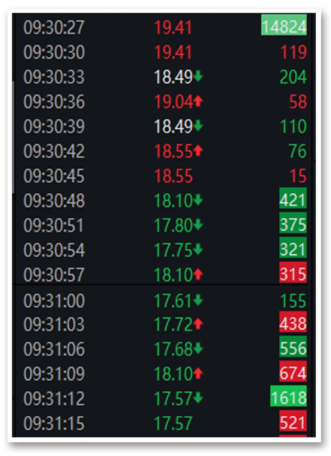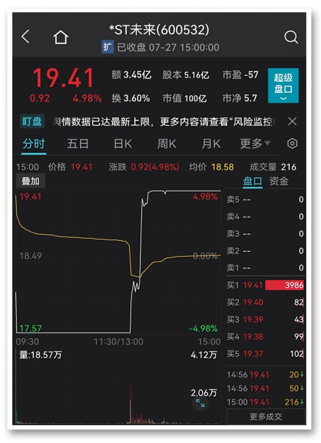 Wind成交明细显示,*ST未来股价早盘从涨停(19.41元/股)到跌停(17.57元/股),仅耗时42秒。