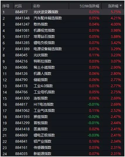 今日,涨幅排名居前的主要以新能源相关板块为主,光伏逆变器、汽车零部件、汽车热管理、锂电、储能、HIT电池等涨幅居前。
