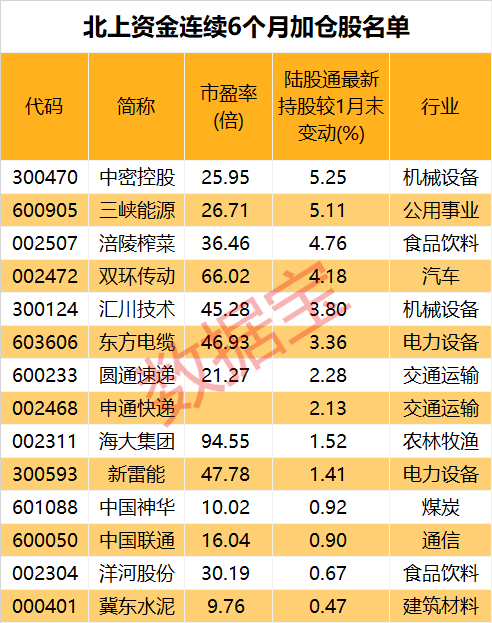 值得注意的是,上述连续6个月获北上资金加仓股中,半数以上的公司估值低于行业同期水平,包括中密控股、涪陵榨菜、海大集团等。