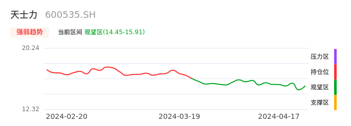 我们来看一下该股的九方特色指标强弱趋势的情况:天士力自03月21日从持仓区下穿到观望区。股价近期持续下跌后,短期出现止跌迹象。后续重点关注能否再次站上多空分界点:15.91元。如未能有效突破则可能进入新一轮空头行情。