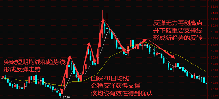 该股低位启动,突破短期均线和趋势线,形成反弹走势。随后冲高回落,回踩20日均线,企稳反弹,该均线支撑的有效性得到确认。随后经过两波行情,每次调整均未下破该均线。但新的反弹无力再创高点,并下破该均线和趋势线,形成新下降趋势的反转形态。