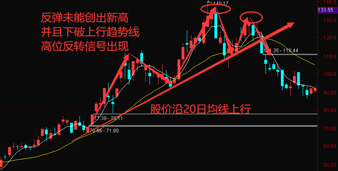 股价沿20日均线形成上行趋势线,多次回踩后获得支撑开始反弹。随着反弹未能创出新的高点,成交量开始萎缩。并且下破上行趋势线,高位反转信号出现。当下破趋势线,并伴随放量或反抽无力时,应果断离场。