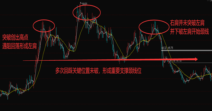 头肩顶形态一般来说,从左肩上涨到头部的这一段走势,往往是由市场的最后一波狂热情绪推动所致,由于此时的多方力量趋势枯竭,因此这一段创出新高的上涨走势往往呈现出明显的“量价背离”形态。