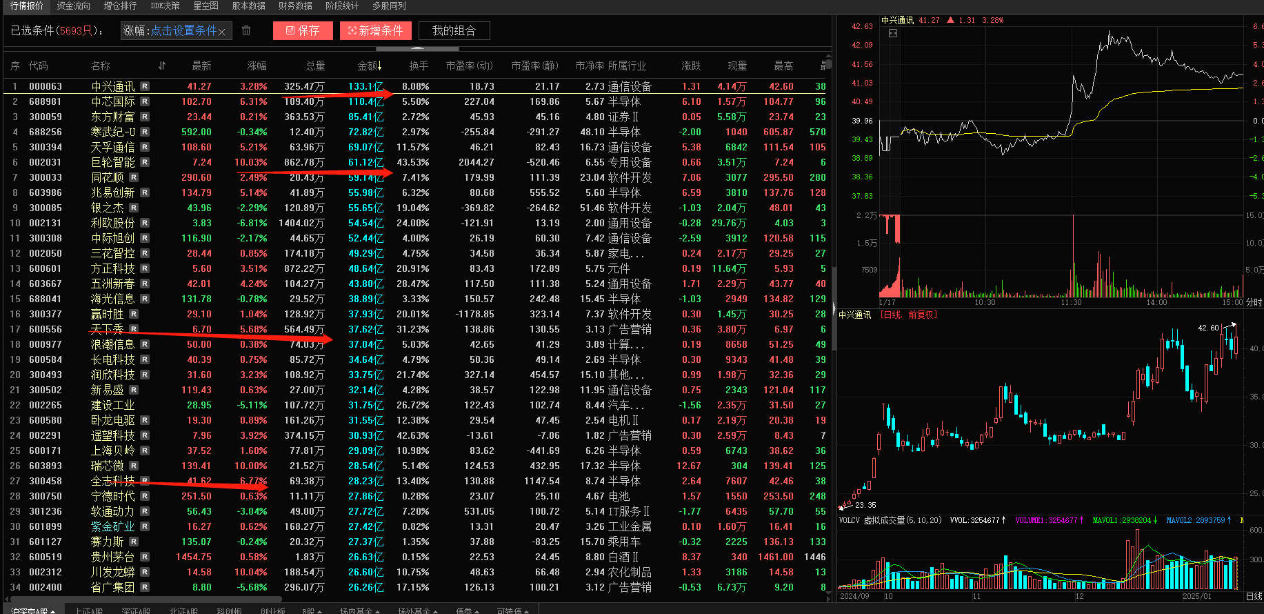 大成交方向上,中兴通讯已经走出趋势,且同时半导体最强走势的中芯国际继续走出趋势,由于港股已经率先走出趋势,说明市场的这里新的逻辑还是以自主可控为主,这里大成交还是给到我们相关的预期方向,所以后续还是要以这些方向去看这些方向为主