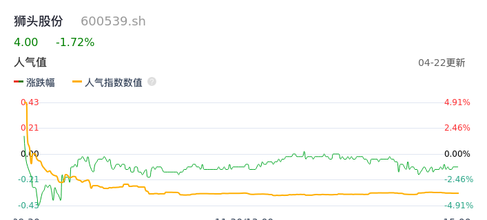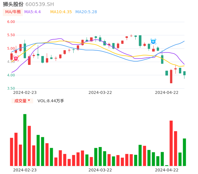 04月22日,狮头股份收报4.00,股价涨幅-1.72%,成交金额3374.80万元,换手率3.67%。