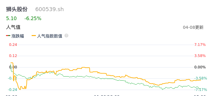 04月08日,狮头股份收报5.10,股价涨幅-6.25%,成交金额3620.34万元,换手率3.02%。