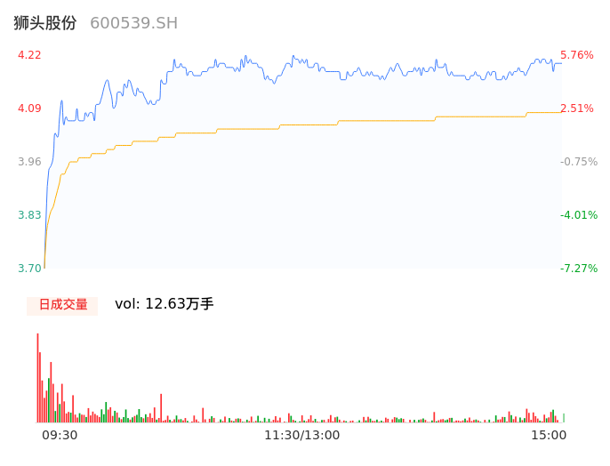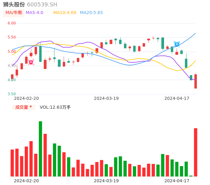 04月17日,狮头股份收报4.19,股价涨幅5.01%,成交金额5156.61万元,换手率5.49%。