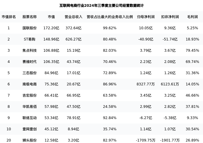狮头股份最新报告期数据为2023年三季度,下表汇总了互联网电商行业内市值靠前的公司2023年三季度主要经营数据