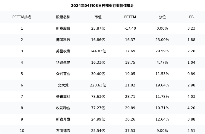 新赛股份最新报告期数据为三季度,下表汇总了种植业行业内市值靠前的公司三季度主要经营数据