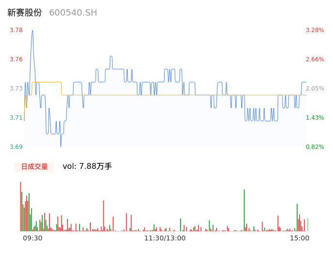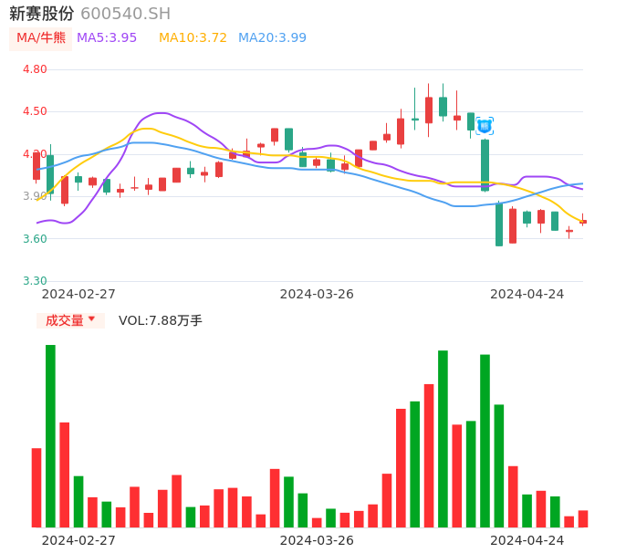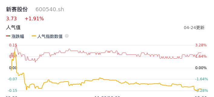 04月24日,新赛股份收报3.73,股价涨幅1.91%,成交金额2939.78万元,换手率1.36%。