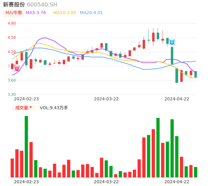 04月22日,新赛股份收报3.66,股价涨幅-3.68%,成交金额3494.64万元,换手率1.62%。