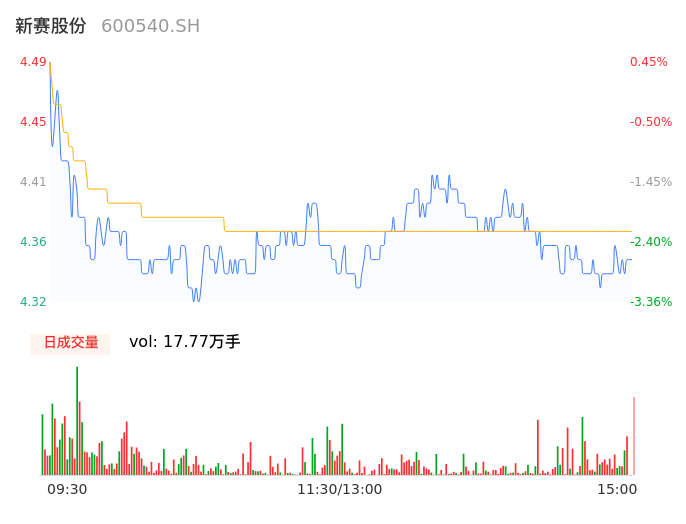 04月12日,新赛股份收报4.37,股价涨幅-2.24%,成交金额7760.76万元,换手率3.06%。