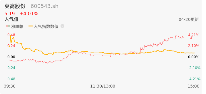 04月20日,莫高股份收报5.19,股价涨幅4.01%,成交金额5234.86万元,换手率3.21%。