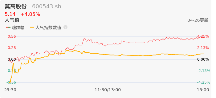 04月26日,莫高股份收报5.14,股价涨幅4.05%,成交金额4828.48万元,换手率2.97%。