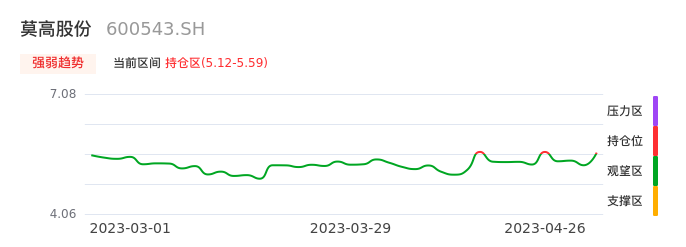 我们来看一下该股的九方特色指标强弱趋势的情况:莫高股份近日从观望区上穿到持仓区。股价短期站稳多头区域,上升动能仍较为充足,可积极持股。后续重点关注上方压力位:5.59元是否能突破上攻。