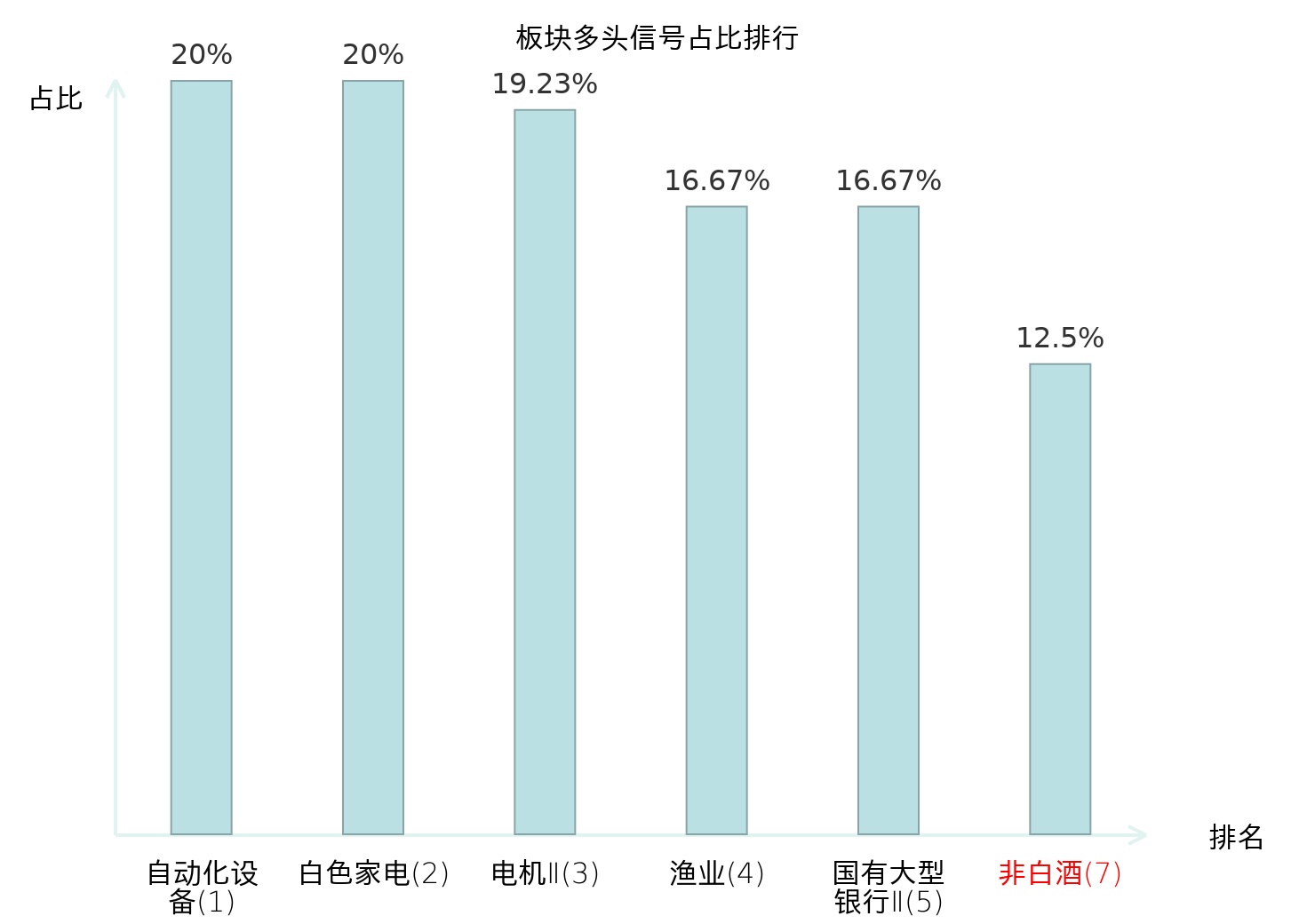 全市场所有行业板块中主力多头信号占比排名中,自动化设备板块位居第一。渔业板块名次提升最快,较昨日上升118位。