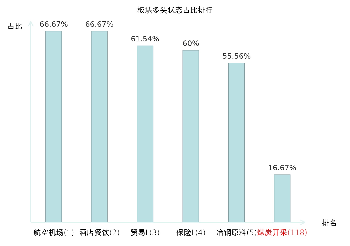 全市场所有行业板块中主力多头状态占比排名中,航空机场板块位居第一。农业综合Ⅱ板块名次提升最快,较昨日上升64位。