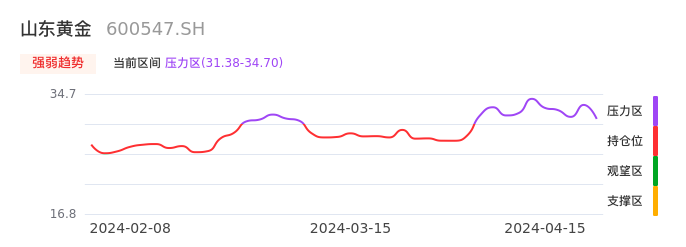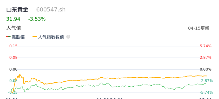 04月15日,山东黄金收报31.94,股价涨幅-3.53%,成交金额18.89亿元,换手率1.65%。