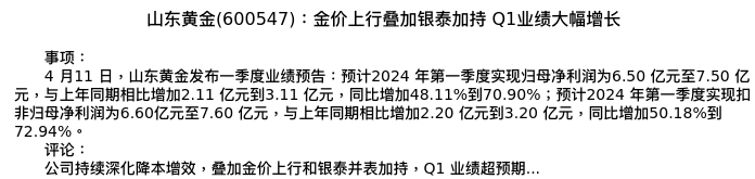 值得注意的是:2024年04月华创证券的马金龙/刘岗分析师,首次发布关于山东黄金的研究报告,标题为:山东黄金(600547):金价上行叠加银泰加持 Q1业绩大幅增长。