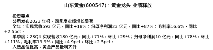 值得注意的是:2024年04月浙商证券的施毅分析师,首次发布关于山东黄金的研究报告,标题为:山东黄金(600547):黄金龙头 业绩释放。