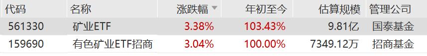 A股永兴材料、江西铜业涨停,中矿资源、铜陵有色、云南铜业、洛阳钼业、西部矿业、湖南白银涨超5%,带动矿业ETF、有色矿业ETF招商涨超3%,年涨幅超100%。