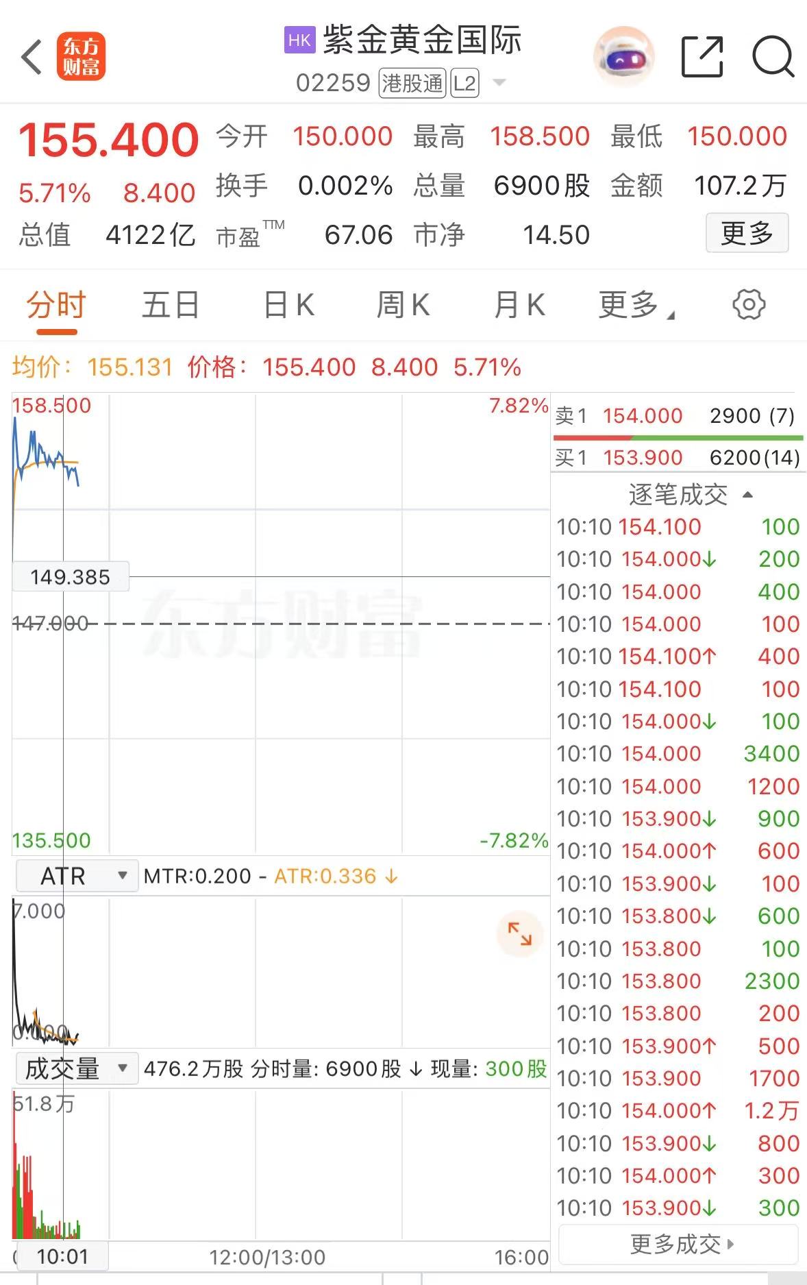 除紫金黄金国际外,港股黄金及贵金属板块今早集体上涨。截至10时01分记者发稿时,港股赤峰黄金涨4.54%,万国黄金集团涨3.44%,潼关黄金涨3.48%,大唐黄金涨1.92%,山东黄金涨1.64%。