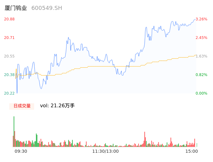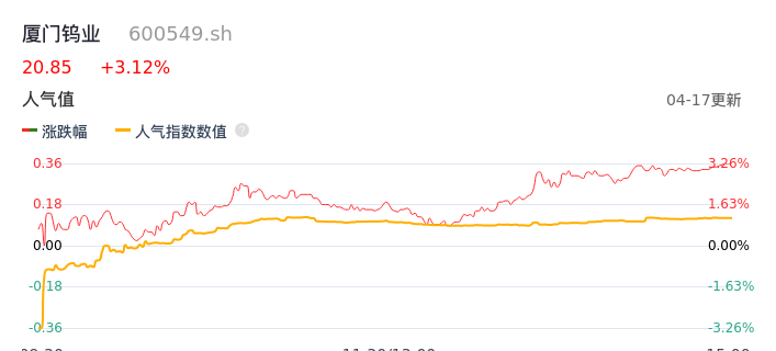 04月17日,厦门钨业收报20.85,股价涨幅3.12%,成交金额4.37亿元,换手率1.50%。