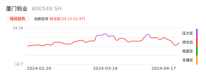 我们来看一下该股的九方特色指标强弱趋势的情况:厦门钨业自04月08日从压力区回到持仓区。股价在持仓区盘整一段时间后,目前有启稳迹象。后续重点关注上方压力位:21.97元是否能重新上攻。