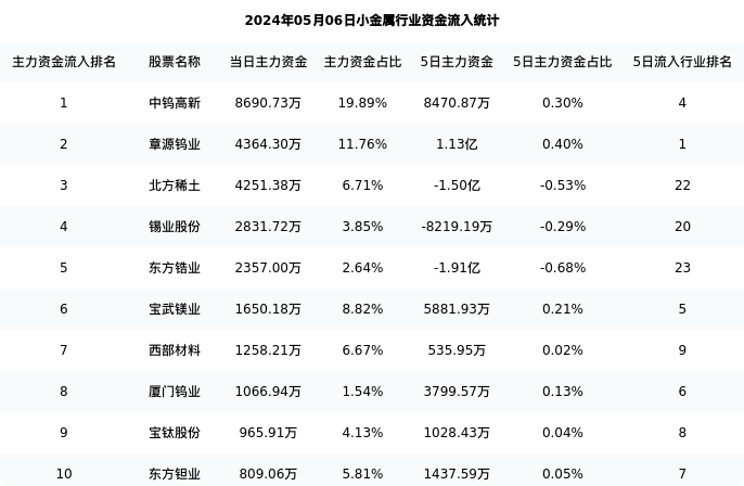 从主力资金流向来看,小金属行业今日主力资金流入36.71亿元,在所有申万二级行业中排名:77/131。