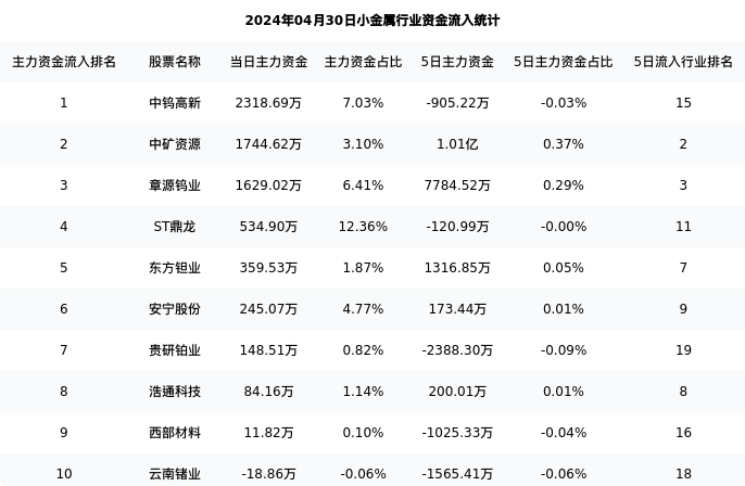 从主力资金流向来看,小金属行业今日主力资金流入30.47亿元,在所有申万二级行业中排名:31/131。