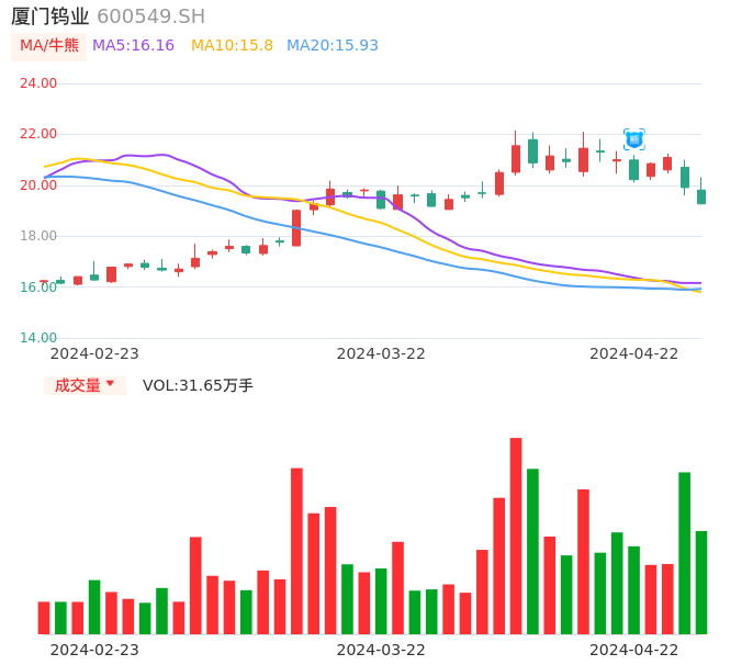04月22日,厦门钨业收报19.27,股价涨幅-3.21%,成交金额6.21亿元,换手率2.24%。