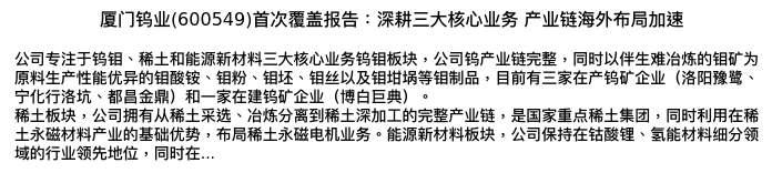 值得注意的是:2024年04月国元证券的马捷分析师,首次发布关于厦门钨业的研究报告,标题为:厦门钨业(600549)首次覆盖报告:深耕三大核心业务 产业链海外布局加速。
